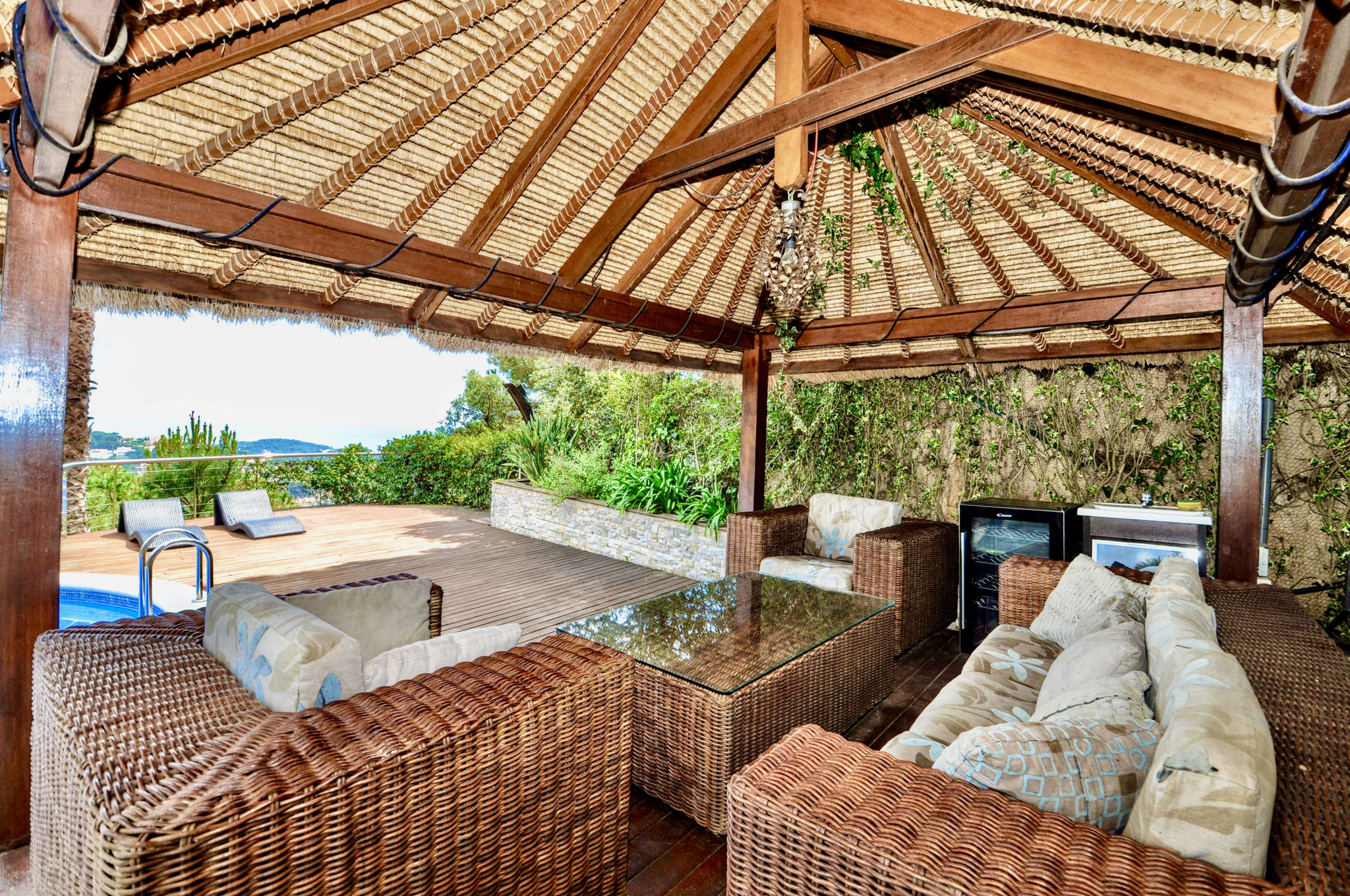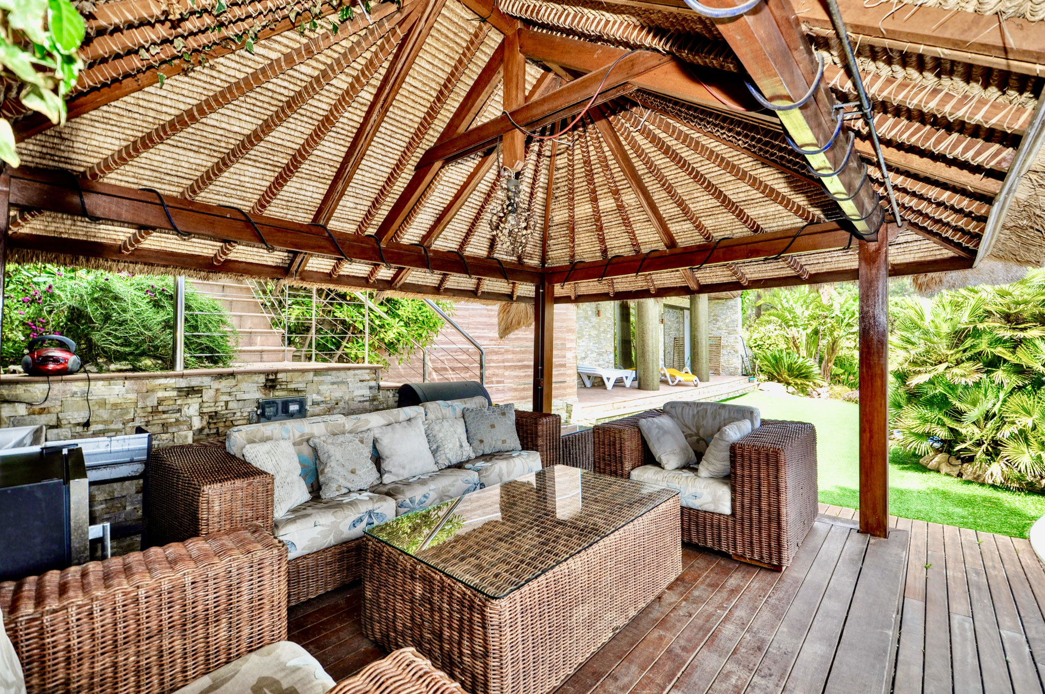 The large pool offers sea views, artificial grass and a covered porch with sofas, chairs and barbecue.